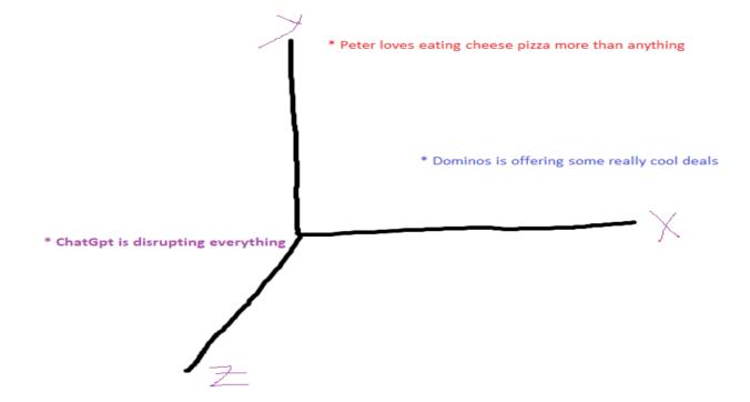For a human it is very easy to figure out that the two sentences (a) and (b) have some closeness since both are connected with pizza, however the 2nd sentence (b) has no relatedness with the rest of the sentences. If these above three sentences are plotted against a three dimensionalgraphitwouldprobablylooklikebelow: