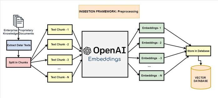 In the pre-processing stage, we designed the Ingestion framework which is the backend component. This is responsibletoingesttheEnterpriseknowledgerepository byscanningthesourcesofarticlesandthenbreakingthem into chunks of tokens or smaller meaningful segments. This strategy is called the chunking strategy. Based on the article source and the way they are formatted, the engineering team needs to determine the chunking strategysothatthearticlesourcecanbeeasilyingestedto buildanLLMknowledgerepository.