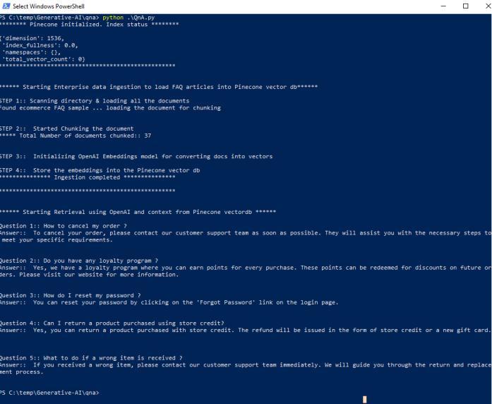 Step 2: Run the QnA python code snippet shared below whichdemonstrateshowthetext data isvectorized using OpenAI’s api and stored in the Pinecone database created inStep1.