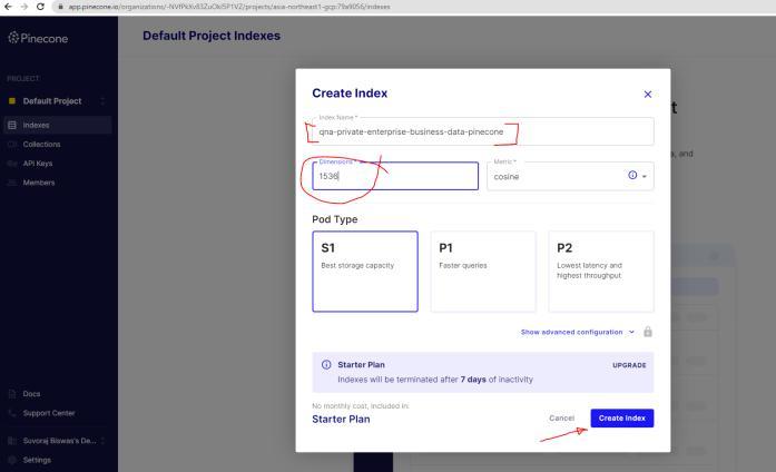 Step 1: Create an Vector index data store in Pinecone SAAS database having dimension size of 1536 and supportingcosinemetricforretrieval