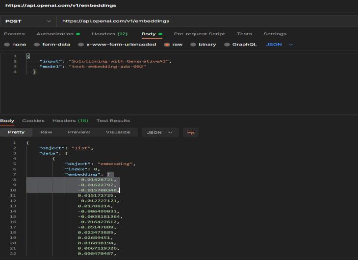 In the machine world embeddings work similarly. It generatesacomplexmathematicalmodeltorepresentthe above lines by generating an “N” number of dimensions. This mathematical representation is called a “Vector”. In theGenerativeAIlandscapeEmbeddings(Vectors)playan important role. Large Language Models like ChatGpt have the capabilities to generate Embeddings of the input contentandatthesametimecanpreservethemeaningsof the supplied data. The LLM model called "textembedding-ada-002" can generate embeddings having 1536 dimensions.
