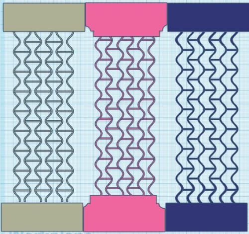 Thethreetwo-dimensionalcellularstructuresweredesignedwithTinkerCadandMatlabsoftware. Thestructures(a),(b),(c) andtheirunitcellsareshowninFig.1.Theshapesoftheunitcellsareconstructedwithtwostraightlinesandtwocurvedlines. Thesizesoftheunitcellsareheight11mm,thewidth9mm,thedepth6mm,andthethickness0.5mm.Thetwocurvedlines ineachunitcellaresinecurve