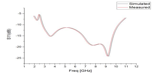 and simulated over HFSS. The simulation results are presented and discussed in comparison with the results that were actually obtained in order to verify and justify the results produced by simulation. According to the results, the antenna performed well in terms of gain, bandwidth, VSWR, return loss, radiation patterns, and other criteria. The antenna has two working resonance frequencies of 2.5 GHz and 3.3 GHz, encompassing the Bluetooth/Wi-Fibandaswellasthemajorityofthe3G,4G, and an anticipated 5G spectrum in the future. When operating in real-time applications, the antenna's VSWR and return loss are obtained to be less than 2 and -10 dB, respectively,atthesefrequencies.