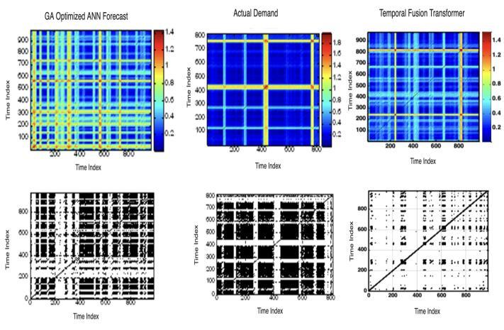 TherecurrenceplotsinFig.7showthecomplexandirregular texture patterns of demand from the GA optimized ANN, actuals,andTFTmodel.TheplotfromtheGAoptimizedANN modelandtheactualdemandexhibitscomplexandintriguing patterns,whiletheTFTmodelrevealshighnoise.Theblue andyellowshadesintheplotindicatethenonstationaritiesin the signal. The GA optimized ANN model captures the underlying patterns of the measured demand data more accuratelythantheTFTmodel.Thecolormapindicatesthe recurrencepointsidentifiedatdifferentneighborhoodsizes.
