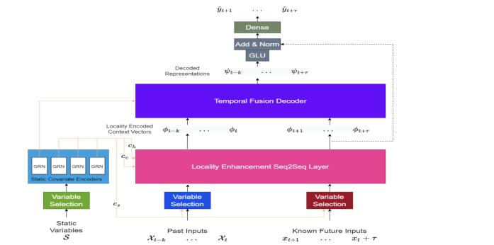 TheTemporalFusionTransformer(TFT)isahighlyadvanced modelthatemploystheTransformerarchitecturetoprocess the complex temporal dynamics present in multiple time sequences.Itcomprisesfivecriticalcomponents,eachwitha distinctfunction.Firstly,thegatingmechanismisutilizedto eliminateunnecessaryelementsandcustomizethedepthand complexity of the network to suit various datasets and conditions.Secondly,thevariableselectionnetworkselects the relevant input variable for each time step. Thestaticcovariateencoderplaysadualrolebyassimilating static features into the network and regulating temporal dynamicsthroughtheencodingofcontextvectors.Fourthly, the TFT is equipped with temporal processingcapabilities that extract both short- term and long-term temporal associationsfromobservationsortime-varyinginputsknown inadvance.Thisisachievedthroughsequence-to-sequence layersforlocalprocessing,aswellasanovelinterpretable multi-head attention block for long-term term extraction. Finally, the model utilizes multi-level prediction interval prediction,whichemploysquantilepredictiontodetermine the range ofpotential targetvalues within each prediction interval. This comprehensive structure, despite its complexity,allowstheTFTtoeffectivelycapturetheintricate temporaldynamicspresentinmultipletimesequences.