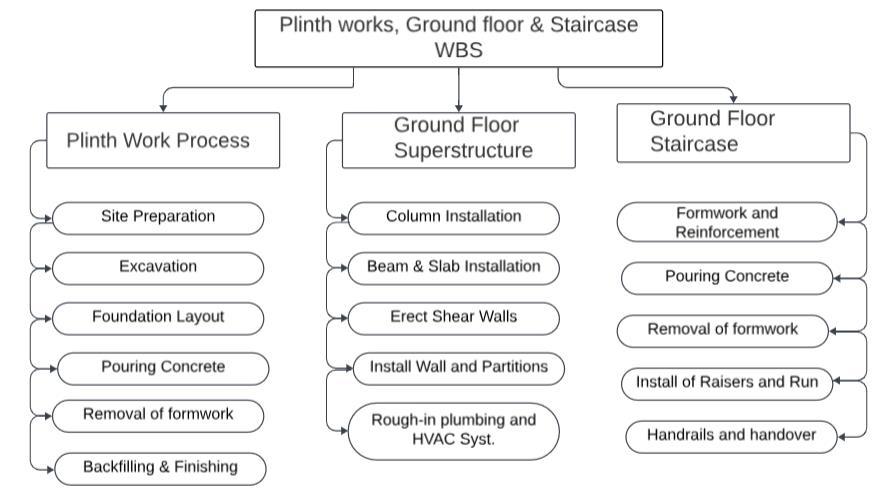 Creatinganewhouseinvolvesvarioustasks,includingbuildingthefoundation, walls,andstairs,alldetailed ina WBS (Work Breakdown Structure) For the ground floor,it begins with sitepreparation, followed by foundation construction, superstructure assembly, wall erection, utility installation, and finishing touches The staircase WBS covers planning, excavation, step construction, finishing work, and adjustments Each step, from ground floor to staircase, is crucial for a safe and functional home, ensuring nothing is overlooked in bringing your dream house to life. Figure4. showstheWBSofplinthworks,groundfloorandstaircasesactivities.