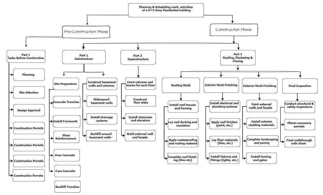 The several tasks involved in building constructionaresummarizedin this project. Theprojectis broken down into its constituent parts by the work breakdown structure, in order to provide a structure that would allow the scope, timeline, and planning of the project to be managed effectively. Figure 2 shows the G+5 Residential building's main work breakdown structure, delineating the various phases, activities, and subactivities essential for project execution and management.