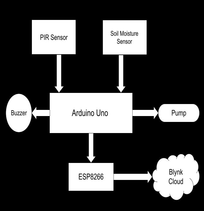 A soil moisture sensor is placed in soil. By measuring water quantity present in that soil, the system will turn on/off the water pump. The soil moisture value will be sent to the Blynk cloud, that is how we can monitor whetherourplantsaregettingwaterornot.
