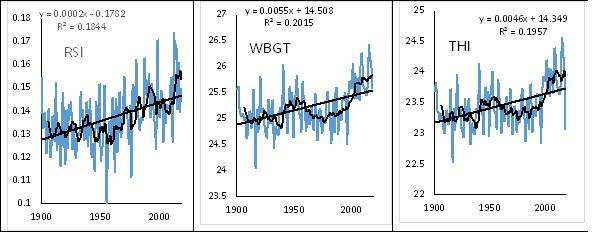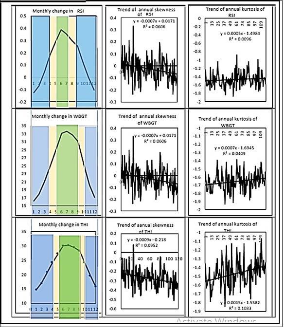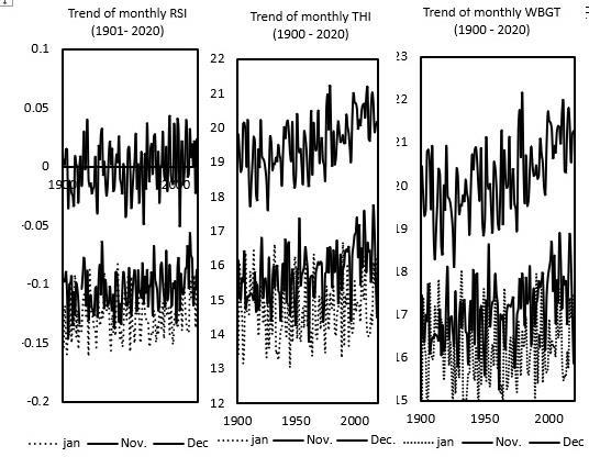 The long-term trends for the mean atmospheric temperature and vapor pressure on monthly basis indicated highest increase is in autumn and moderate increase in winter months, while summer months show minimum increase. These climatic trends also impact on trendsofthethermalcomfortindices. RSI,WBGTandTHI showedhigherdiscomfortlevelduringthemonthsofMay toSeptember.Trendsoftheskewnessandkurtosisforthe 120 yrs. (1900 -2019) indicate highest change for THI. It showed highest increase in Kurtosis and decrease in skewness indicated as result of climate change in the last century. Long term trends of annual RSI, WBGT and THI mean value indicating rising in indices values from 1980