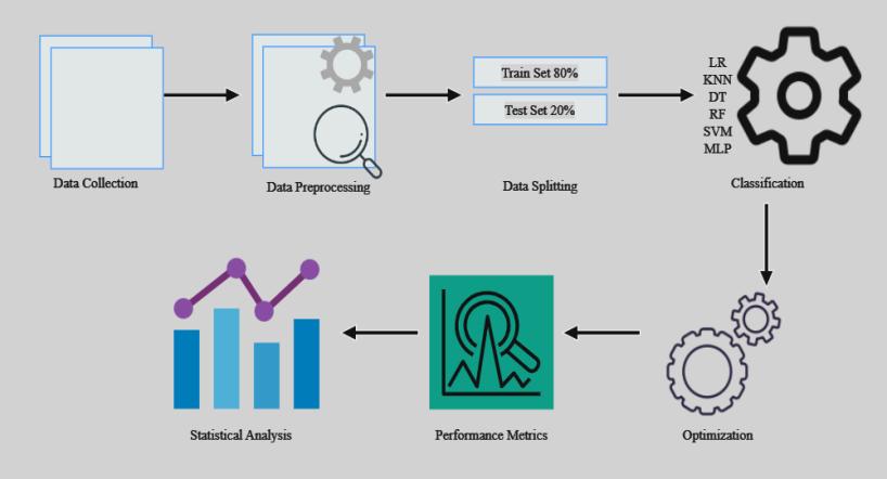 ResearchapproachinvolvedvariousstepsasshowninFig -1. First, data was acquired and pre-processed. Data were scaledandseparatedastestandtrainsets.Thendatawere classified using six different classifiers, optimized using grid search and by trial basis. In the final phase, performance of each classifier was evaluated using evaluationmetrics.