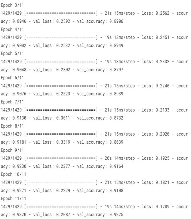 Wetrainedthemodelusingbatchsize35and11epochs. . The training process was stopped when the validation loss did not improve after 11 epochs. As the goal function for optimizing the model presented in fig.2, we usedcross-entropyloss.