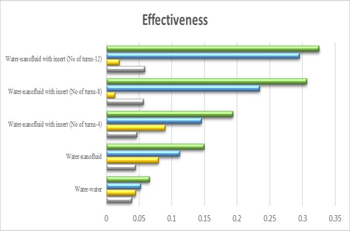 Figure5showsthecomparisonofheattransferratesamong waterasahotfluidandcoldfluid,hotfluidasawaterand coldfluidasananofluidwithdifferentnumberofturnsofthe insertlike4turns,8turnsand12turns.Fromthegraph,it canclearlybeseenthatasthethermalpropertiesofthefluid increases,rateofheattransferincreasesduetohighthermal propertiesofnanofluidincomparisonwithwater.Butaswe putainsertoftwistedtapeturbulator,itprovidesturbulence inthefluid.Turbulenceincreasestheconvectiveheattransfer coefficient of the fluid. And we know that convective heat transfer coefficient of turbulent flow is greater than the laminar.