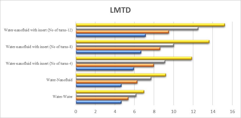 Fig4showsthecomparativevaluesofLMTDofconcentric circularplanetubeswithoutanyinserts,withwater-water and water-nanofluid arrangement respectively. The comparisonshowsthatthemaximumvalueofLMTDforthe sameflowratesisachievedforwater-nanofluidarrangement, anditwasatitsmaximumon0.2kg/swithavalueof9.21088. Thisgrowthisduetothefactthattemperaturedifferenceat the inlet and exit increases. Since LMTD is directly proportionaltochangeintemperatureatinletandexit.Thus, italsoshowsincreasew.r.tthemassflowrate.