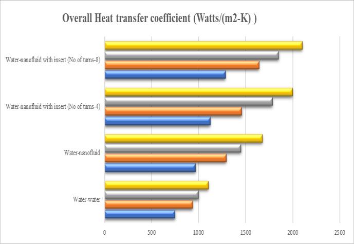 Fig.3showsthecomparativevaluesofOverallHeattransfer coefficient of concentric circular plane tubes without any inserts,withwater-waterarrangementandwater-nanofluid arrangement respectively. The comparison shows that the maximum valueofOverall Heattransfercoefficientforthe sameflowratesisachievedwater-nanofluidarrangementat 0.2kg/swithavalueof2245.81(Watts/(m2-K)).