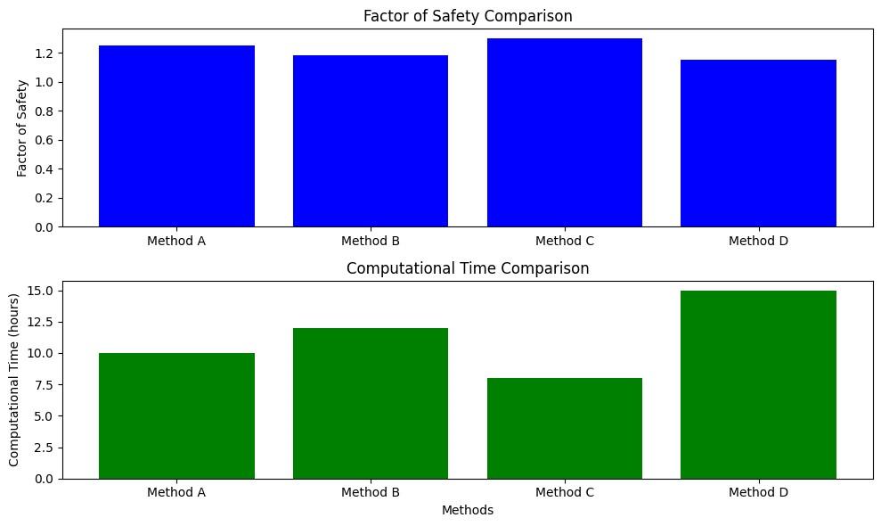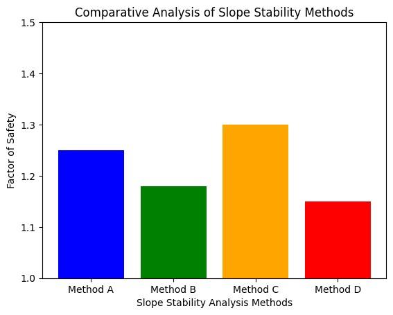 Method B provides the highest factor of safety, indicating better stability. Method A has the lowest factor of safety, suggesting potential instability. Method B and Method C identify different slip surface shapes, showing variability in critical surface determination. Method A is the fastest, but Method D requires the most computational time. Consider trade-offs between accuracy and computational efficiency. All methods except Method D exhibit convergence, indicating stablesolutions.ThelackofconvergenceinMethodDsuggestspotentialissueswiththemodelingapproach.