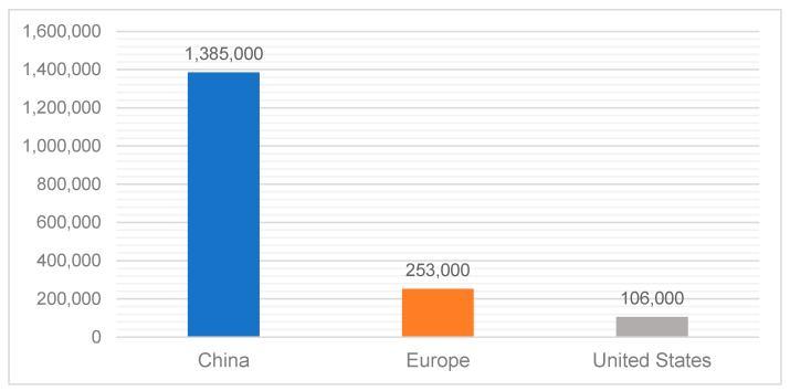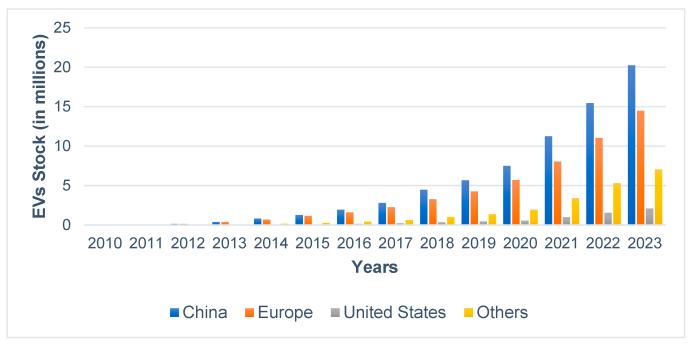 Chinaisnowtheworld'slargestmarketforelectricvehicles because to these incentives, which have caused a spike in sales of electric vehicles there. Figure 2 shows the worldwide inventory of electric cars, including plug-in hybridelectricvehicles(PHEVs)andbatteryelectricvehicles (BEVs), broken down by country. As Figure 3 illustrates, China is also home to the greatest number of public EV chargingstations.[4]