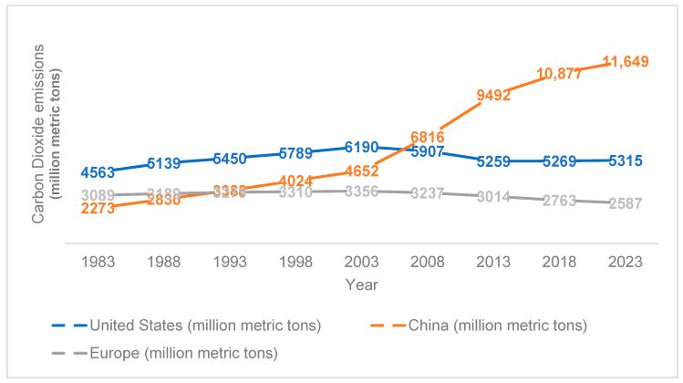 Figure 1. Energy-relatedcarbondioxideemissionsinthe US,China,andEuropefrom1983to2023[3]