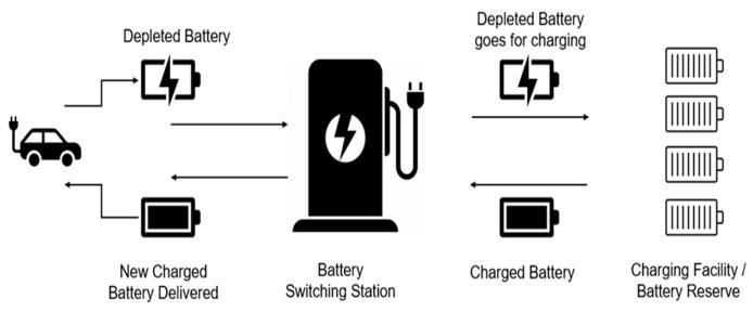 Batteryswappingstationscouldbeusedinsteadofbattery charging stations to reduce range anxiety. At battery switchingstations,standard,fullychargedbatteriesarekept available so that electric vehicle drivers can rapidly swap them out and resume their journey. EVs at a highway charging point can be switched out right away in this manner. Figure 6 shows the working mechanism of the batteryswappingstations.Teslaandbatterysuppliersinthe US and Europe are already using this instantaneous EV chargingtechnology.