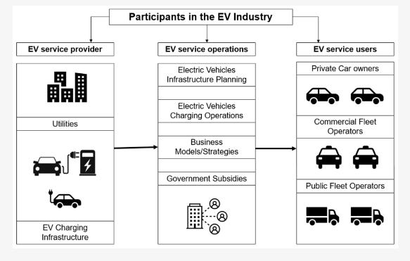 Utilities, state and local governments, and private sector participantssuchasEVserviceproviders,fleetemployees, and individual automobile owners are examples of public sector operators in the EV market. Diverse operational decisions are made by variable adopters, which include privatevehicleowners,managersofprivatecompanyfleets, and public fleet operators. At-home charging, public charging,andbattery-swappingstationsshouldbeoptimised forthechargingmodelsbasedonthetypesanddistribution of adopters. Infrastructure rollout and incentive programmesarealsorelatedtothetypeofclient.Figure4 provides a summary of the major issues faced by the membersoftheEVservicebusiness.