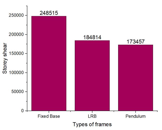 Fortotalbaseshearshowthatonintroductionofisolatorsto thefixedbaseframethevalueofbaseshearisreduceupto 1.46timesofthefixedone.Forisolatedcasesthemaximum reduction in base shear is observed in case III (friction isolatorwithuniformstiffness)andalmostequalreduction isthereforbothcase2-uniformrubberisolatorstiffness& case3pendulumisolatorstiffness.