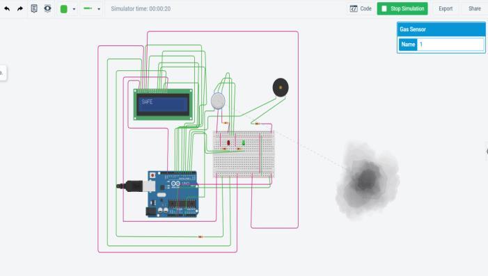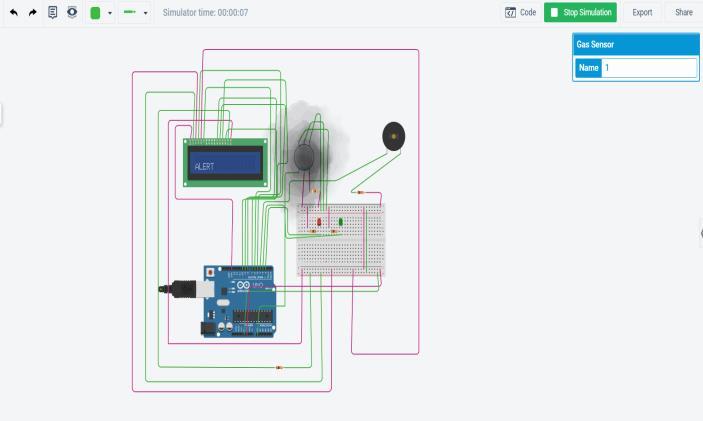 IntheabovesimulationImageitisclearlyshownthatwhen the harmful gas is far away from the sensor then the LCD displayshowsSAFEasanoutputandthegreenlightison.But assoonasgasgoesnearthesensor,theLCDdisplaygives ALERTasanoutput,thenthe redlightsturn onandBuzzer startsbuzzing.