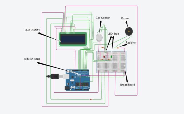 11ThesesensorsareconnectedtoanArduinoUnoboardwith agreenandredLED.Ifthegaslevelisbelowthedangerlimit, the green LED will light up; otherwise, the red LED will remaindark.