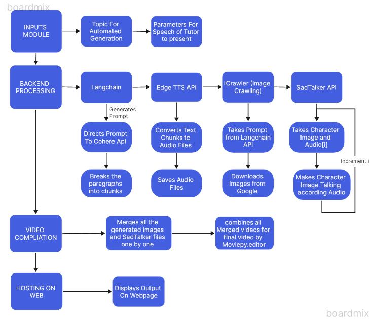 ABSTRACT - This paper introduces a novel API-driven framework for automating the creation of video tutorials, addressing the burgeoning demand for high-quality educational content in online learning environments. Drawing upon a comprehensive suite of APIs, including Cohere for semantic analysis, Lang-chain for linguistic refinement, iCrawler for multimedia retrieval, TextToSpeech for audio synthesis, and SadTalker for sentiment analysis, our system offers a sophisticated solution for generating engaging and informative instructional videos. We present a detailed exposition of the system architecture, implementation strategies, empirical evaluations, and future directions, demonstrating the effectiveness and versatility of our approach in meeting the diverse needs of educators and learners inthe digitalera.