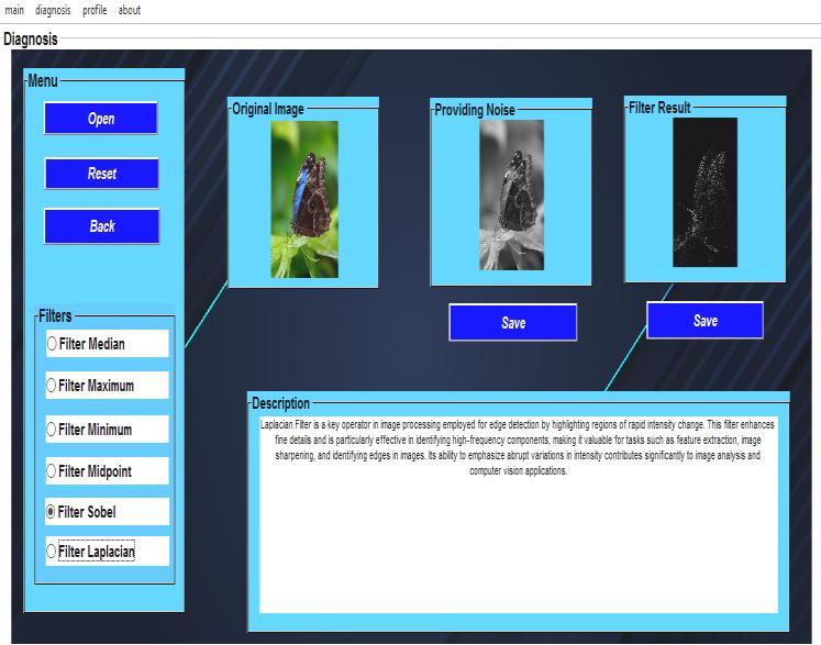 2. Now, just select the desired filter you want to see the resultandprocessedimagewillbeseenontheaxesalong withexplanationinthedescriptionofthefilterused.