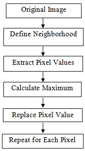 The Maximum Filter is a digital image processing technique used primarily for enhancing or modifying imagesbyadjustingtheintensityvaluesofpixelsbasedon theirneighboringpixels.Itworksbyreplacingeachpixel's value with the maximum pixel value within a defined neighborhood. The maximum filter is particularly useful for tasks such as noise reduction, edge detection, and featureextraction.Itachievesthisbyemphasizingregions of high intensity within each neighborhood, effectively smoothing out noise and enhancing edges and other features.WorkflowofMaximumFilterisshowninFigure 4.