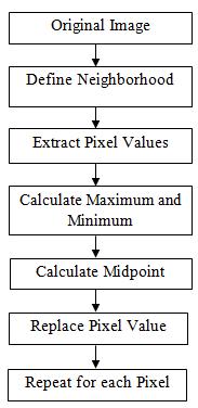 ThekeyfunctionoftheMidpoint Filteris to reduce noise while preserving edges and fine details in the image. By replacing each pixel with the midpoint value of its neighborhood, it effectively smoothens out variations in intensity caused by noise while maintaining the overall structure of the image Work flow of Midpoint Filter is showninFigure6.