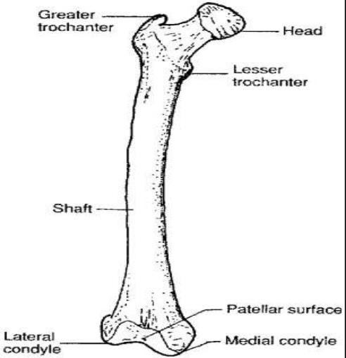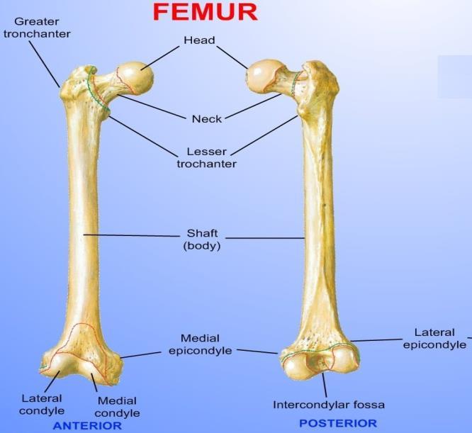 1. LargestHumanBone:Itconnectstothepelvisatthe proximalendtoformthehipjointandtothetibiaat thedistalendtoformthekneejoint.Thefemurin thebodytakesthelargestpercentageoftheweight ofthebody.Theshaftofthefemuriscylindricalwith approximatelycircularcrosssectionshape.