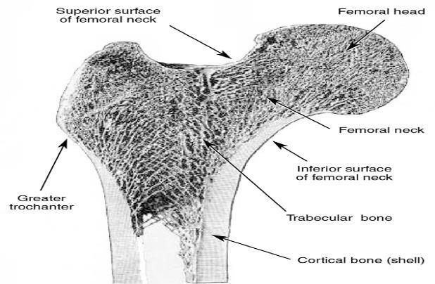 Figure shows the anatomy of the human proximal femur (upperthirdofthehumanfemurbone),whichincludesthe femoral head, femoral neck,greater trochanter, and upper portion of the femoral stem. The femoral neck is the narrowed region directly below the femoral head. Cortical bone is the outer (hard) shell of a bone having higher material density. Trabecular bone is the relatively soft,