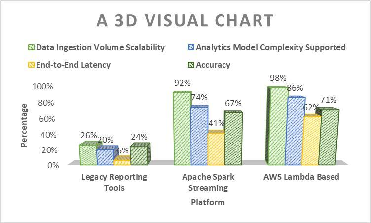 The3Dchartbelowcontrastslegacyreportingtools,ApacheSpark,andAWSLambda-centricsolutionsbasedonfour criticaldimensions:volumescalability,algorithmicsupport,responsiveness,andaccuracy allofwhicharerequired forreal-timeobservability.Legacytechnologieshavedemonstrableconstraintsontime-criticalanalyticsduetobatchcentricdesignlimitations.Stream-optimizedarchitectures,ontheotherhand,significantlyincreasecapabilitiesacross the indexed categories, allowing for advanced decisioning while keeping up with soaring data streams thanks to AI acceleration.