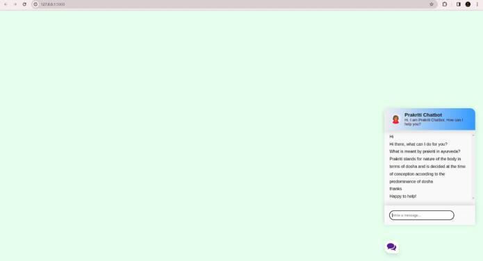 Personalized Prakriti Assessment: Our primary focus is to create an engaging and intuitive chatbot interface that mirrors a natural conversation, allowing users to explore andunderstandtheiruniquePrakriticonstitutionthrough simple yet insightful interactions. By integrating Ayurvedic principles into the conversation flow, the chatbot aims to provide a personalized assessment experiencetailoredtoeachindividual'sresponses.