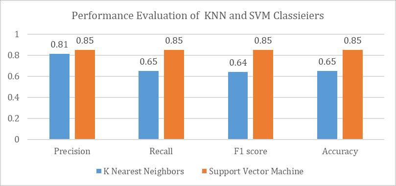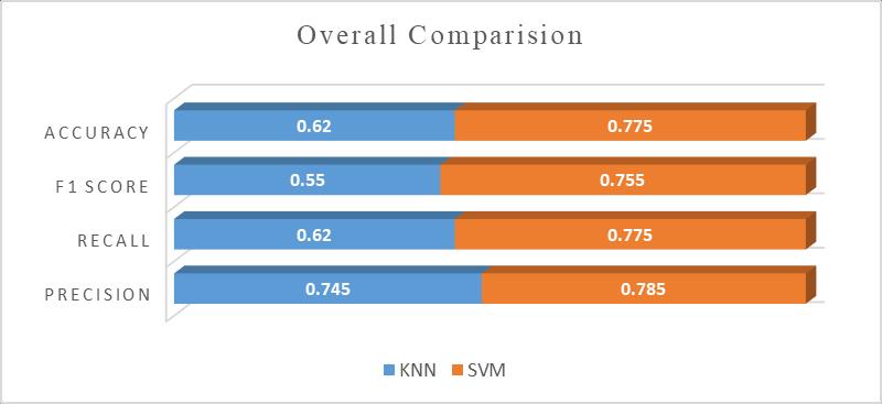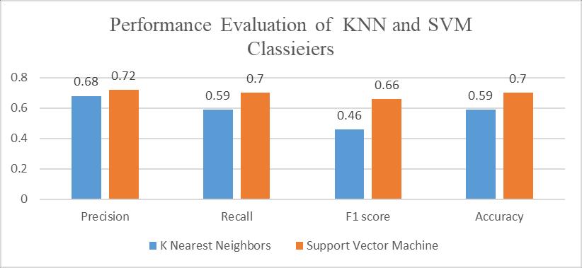 Thecurrentstudyfoundthataverageofprecision,recall, accuracyandf1scoreofKNNwere74.5%,62%,55%,625 respectively and SMV were 78.5%, 77.5%, 75.5%, 77.5% respectively.