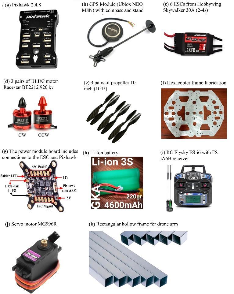 Todesignadrone,thereisawidechoiceofmodelsinterms of weight, flight autonomy and stability characteristics for each required mission. The mission of the drone in this project is to develop a hexacopter capable of flying stably and transporting light packages (maximum 1 kg). In addition, the flight time must be carefully calculated according to the distance traveled. Therefore, internal stability is very important because the goods sent must reach their destination within the specified time. Fig. 2.1 showsthemaincomponentsselectedfora deliverydrone. All components selected take into account the availability of funds with the main aim being that the system can providehighperformance.