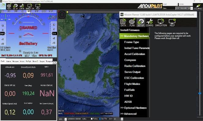 The window for the Mission Planner can be seen in Fig. 2.3. Settings are done via the SETUP menu and must be done starting from Frame Type, Initial Tune Parameter, Accel Calibration, Compass, Radio Calibration, ESC Calibration, Flight Modes and Failsafe in the Mandatory Hardware Submenu. Next, set the battery monitor used and test the motor's functionality in the Optional Hardware Submenu. Settings for drone operation can be doneviatheCONFIGMenu,thisincludeschangingthePID (Proportional–Integral–Derivative) controller value if the available default PID is not able to optimize drone performance. How to set autopilot in Mission Planner can furtherrefertoSupartaandHandayani[11].