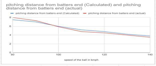 Graph1showsthatforeveryincreaseof10kmphin “speed of the ball inkmph”,“pitchingdistance from batterendinmeters”decreasesbyabout0.639m.