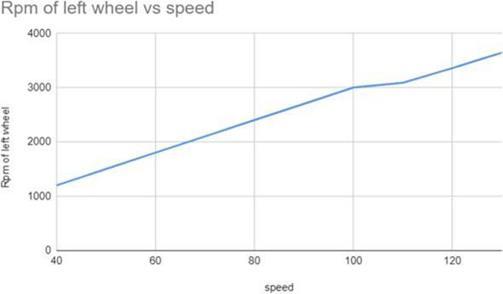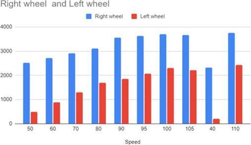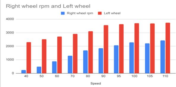 B.WhentheRpmoftheleftwheelwasgreaterthan the right wheel, an off spin was observed. Where 40kmph had the lowest values for “Right wheel rpm”(250)and“LeftwheelRpm”(2303).