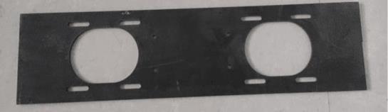 The base plate is made of Mild steel of grade A36. It also features remarkable corrosion resistance in both interiorandexteriorconditions.Thedimensionsofthe plate are 500 x 120 mm, having a thickness of 4mm.The base plate is designed in such a way that it will be easy to deliver cricket balls of different dimensions because of the adjustment provided. Its functionisthatitwillbeusedtomountthemotorand the wheel, and it will be used to adjust the distance between the two wheels. The manufacturing process of laser cutting is used to make holes of different dimensionsonasolidmetalplate.