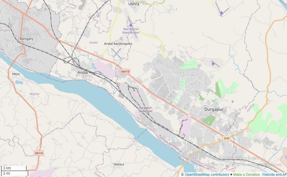 Fig-2:MapshowingthelocationofDurgapurwithrespecttotheRaniganjcoalfieldsand theirlinkage(OpenStreetMap,2023)