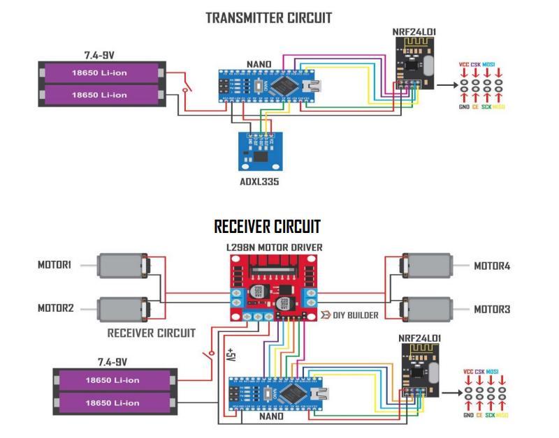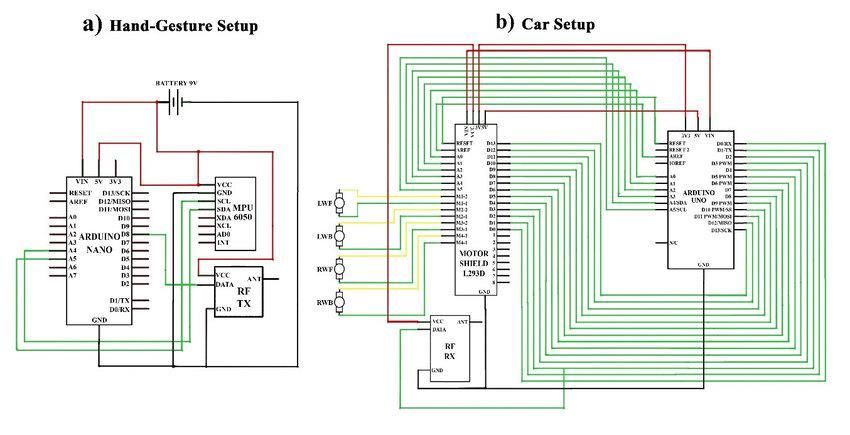 For the hand-gesture Setup: An Arduino Nano is used along with an MPU-6050 accelerometer and an RF transmitter. The MPU-6050 is connected to the Arduino Nano,withitsSLCpinconnectedtoanalogpinA5,SDAtoA4, GroundtoGND,andVCCtothe5VpinoftheArduinoNano. TheRFtransmitter'sDATApinisconnectedtodigitalpinD8 oftheArduinoNano,withVCCconnectedto5VandGround toGND.