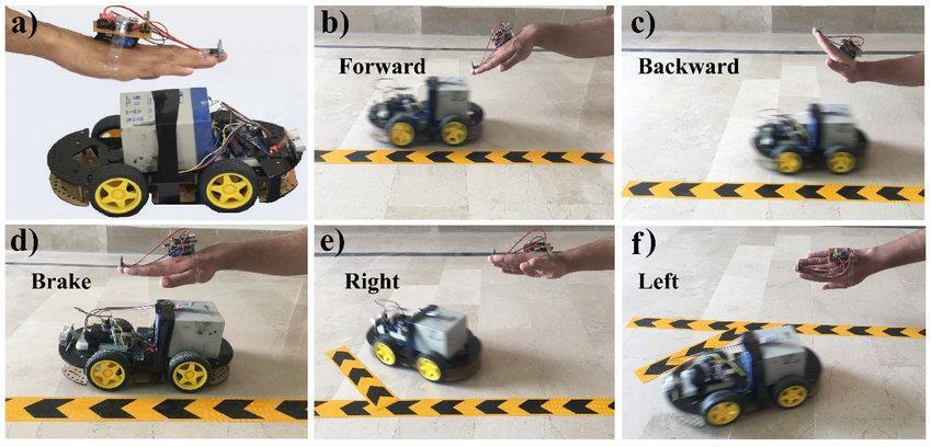 Formovementgestures,tiltingthehanddownward signalsforwardmovement,causingallfourwheelstorotate forward (Figure a). Tilting upward signals backward movement,withallwheelsrotatingbackward(Figureb).A straighthandsignalsthecartostop,haltingallfourwheels (Figurec).Tiltingthehandrightsignalsarightturn,rotating therightdiagonalmotorsforwardforarightwardmovement (Figure d). Tilting left signals a left turn, rotating the left diagonalmotorsforwardforleftwardmovement(Figuree).