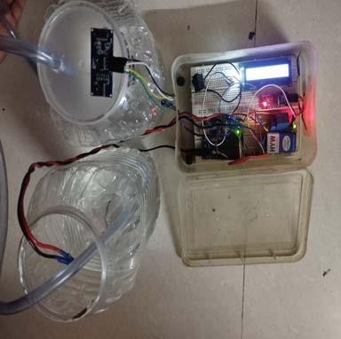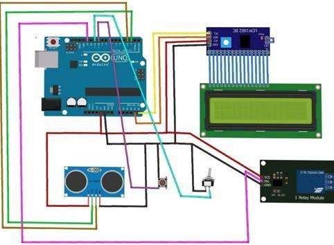 The pump is automatically turned off after it reaches the predetermined upper water level.. This happens when the distance of the water surface from the ultrasonic sensor is less than h90%. The ultrasonic sensor’s Echo and Trigger pins are connected to pins 8 and 9 of the Arduino board respectively. Now, connect pin 13 of the Arduino to the input pin of the relay board. Attach thepump to the relay board's AC circuit. Consider relay as switch. The LCD module, equipped with an I2C interface can be connected by using only two analog pins, which in this case are connected to the A0 and A1 pins of the Arduino board. Now, provide the +Vcc and GND connections to the ultrasonic sensor, relay board, and LCD module using +5V andGNDfromArduino.Wealsohavethepushbuttonanda SPSTswitchatpin10and14respectivelywhichhelpus to switch between the auto/manual modes for the pump operation.