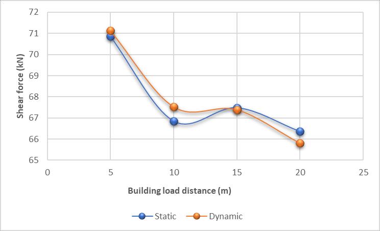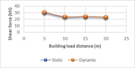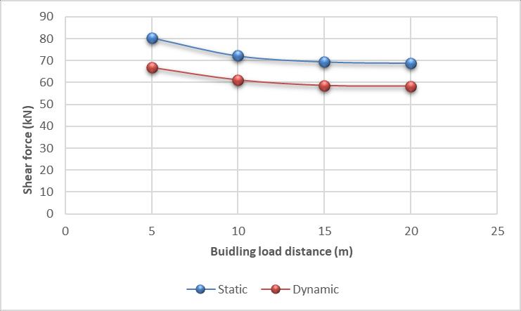 Chart9and10showsthatthebuildingloaddistancefrom excavationlineandthecorrespondingmaximumshearforce inthewallafterthefinalstageofexcavation.Fromthegraph wecanseethattheshearforceisnotmaximumwhenthe building load is placed at the excavation line but it is maximumwhenthebuildingloadisplacedat5mfromthe excavation line in the case of static analysis. When the building placed further away from the excavation line the shearforcekeepsdecreasingandalmostbecomeconstant (i.e., at 8m). The shear force in the front pile is maximum whencomparedtobackpileincaseofdoublerowmicropile withnailing.