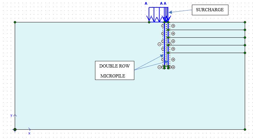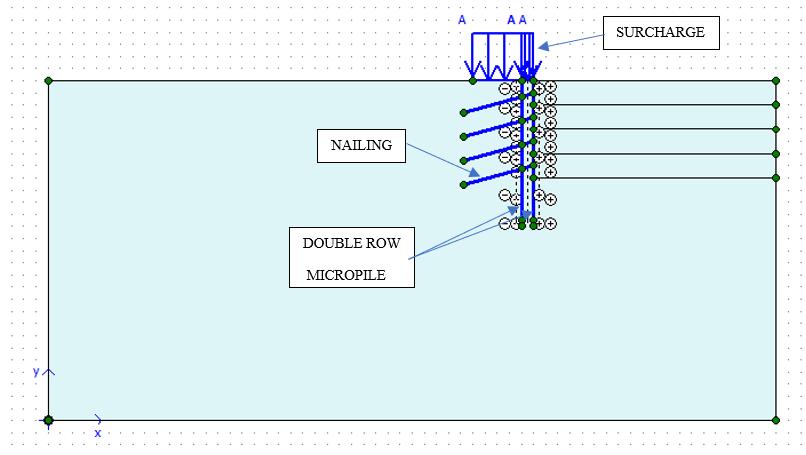 Instaticanalysistheloadswhichareactingonthesystemis constantwithrespecttotime.So,ateveryinstanceoftime the magnitude of the forces acting on the micropile is constant.Toperformstaticanalysisinfiniteelementanalysis programme the geometry of the problem is defined, the double row micropile with and without grouted nailing systemismodelledandtheanalysisiscarriedoutinstage manner.