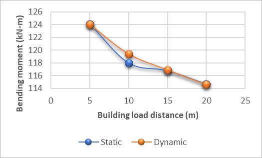 Chart 7 and 8 shows that the building load distance from excavation line and the corresponding maximum bending momentinthewallafterthefinalstageofexcavation.From thegraphwecanseethatthebendingmomentismaximum whenthebuildingloadisplacedattheexcavationline(i.e.,at 0m) and it will goes on decreasing as the building load is placed away from the excavation line (for both static and dynamiccondition).Aswekeeponmovingthebuildingload away from the excavation line the variation of bending moment will almost become constant (i.e., at 8m). The bending moment in the front pile is maximum when comparedtobackpileincaseofdoublerowmicropilewith nailing.