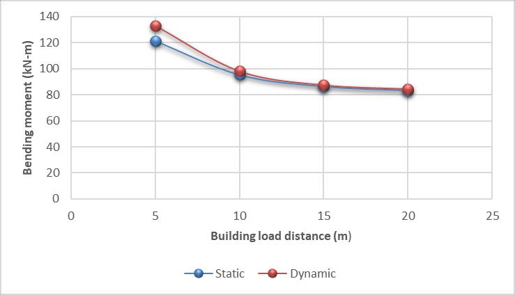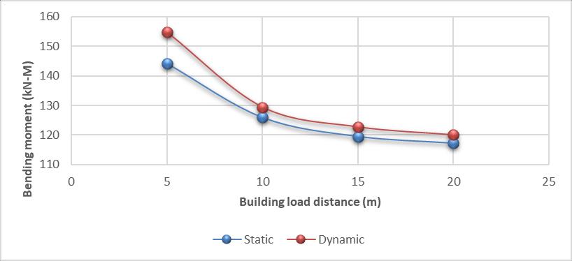 Chart 2 and 3 shows that the building load distance from excavation line and the corresponding maximum bending momentinthewallafterthefinalstageofexcavation.From thegraphwecanseethatthebendingmomentismaximum whentheSurchargeloadisplacedattheexcavationline(i.e., at0m)anditwillgoesondecreasingasthesurchargeloadis placedawayfromtheexcavationline(forstaticanddynamic condition).Aswekeeponmovingthesurchargeawayfrom the excavation line the variation of bending moment will almostbecomeconstant(i.e.,at20m).Thebendingmoment inthebackpileismaximumwhencomparedtofrontpilein caseofdoublerowmicropile.