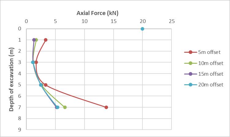 Chart11and12showsthatcomparisonoftheaxialforcein thewall ateverystageof excavation(i.e.,at2mintervals) andforall the casesof buildingload atdifferentlocations from the excavation line (static and dynamic condition). From graph it is seen that the axial force initially will be minimumandgoesonincreasingasthedepthofexcavation increases and it will be maximum at the final stage of excavationi.e.,at8m.Theaxialforcewillbemaximumwhen thesurchargeloadisattheexcavationlinei.e.,at0mandit will be least when the surcharge is at 20m from the excavationline