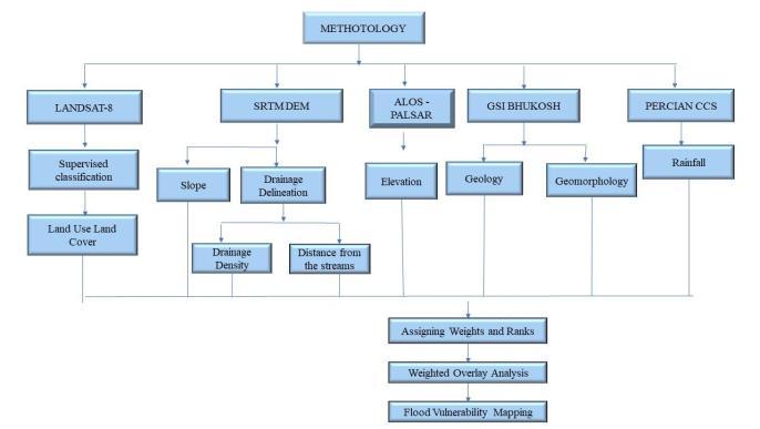 The approach developed for this analysis has a simple structureandcanbeperformedinaGISenvironment.The weightedoverlaymethodintheArcGISsoftwarewasusedto createafloodhazardvulnerabilitymap.Mapsoftherelevant factors were created first. Then these maps were classed, followed by an overlay using a weighting factor [6]. The detailedmethodologyisshownintheflowchart.